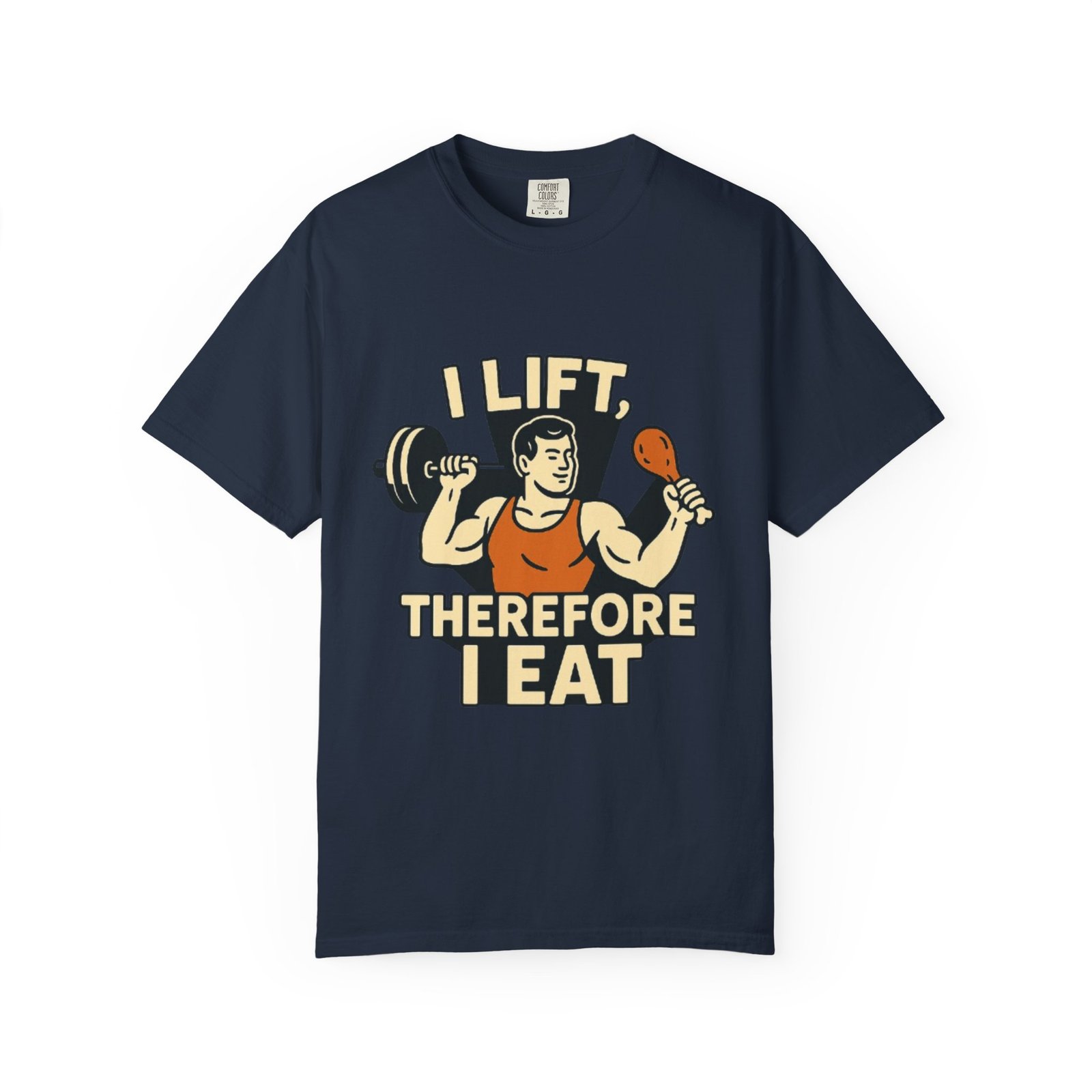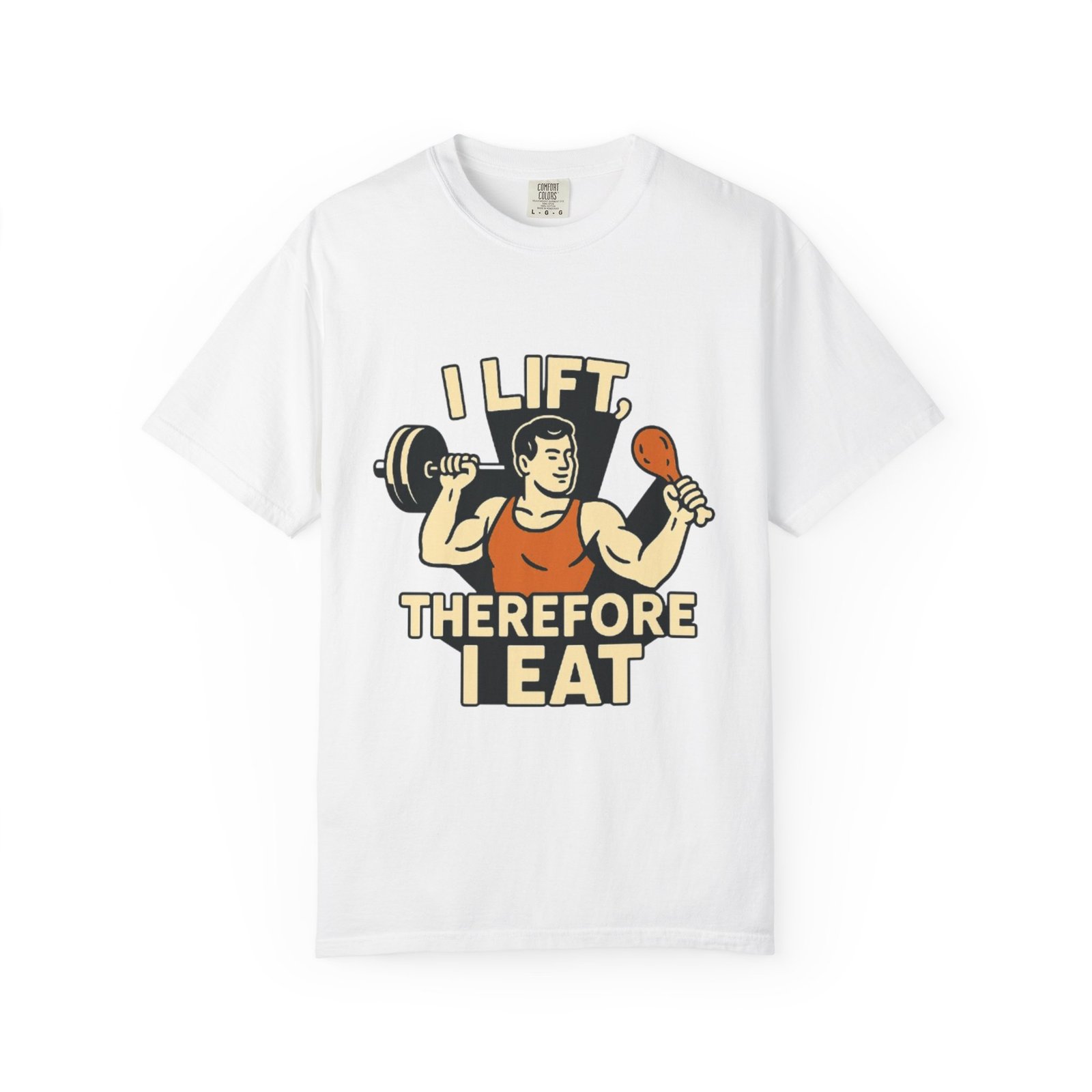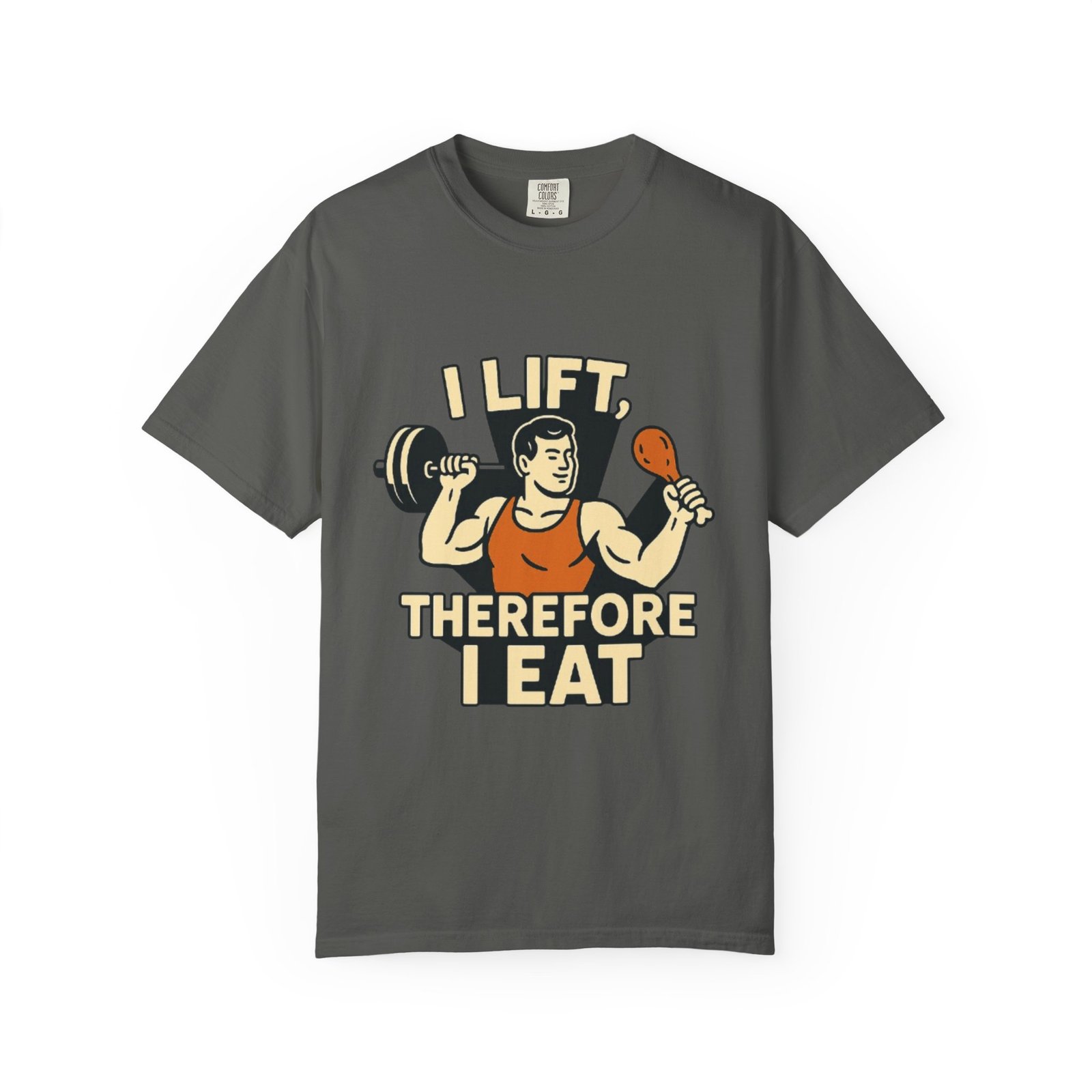 Humorous Fitness T-Shirt – I Lift Therefore I Eat, Gym Shirt, Workout Gift, Fitness Humor, Exercise Apparel, Funny Workout Tee